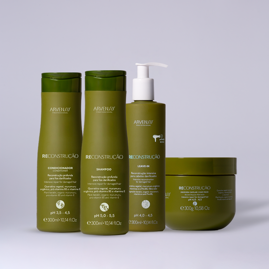 O Kit Reconstrução Arvensis foi desenvolvido para tratar cabelos danificados, enfraquecidos, elásticos ou quebradiços , devolvendo resistência, densidade e brilho saudável aos fios.